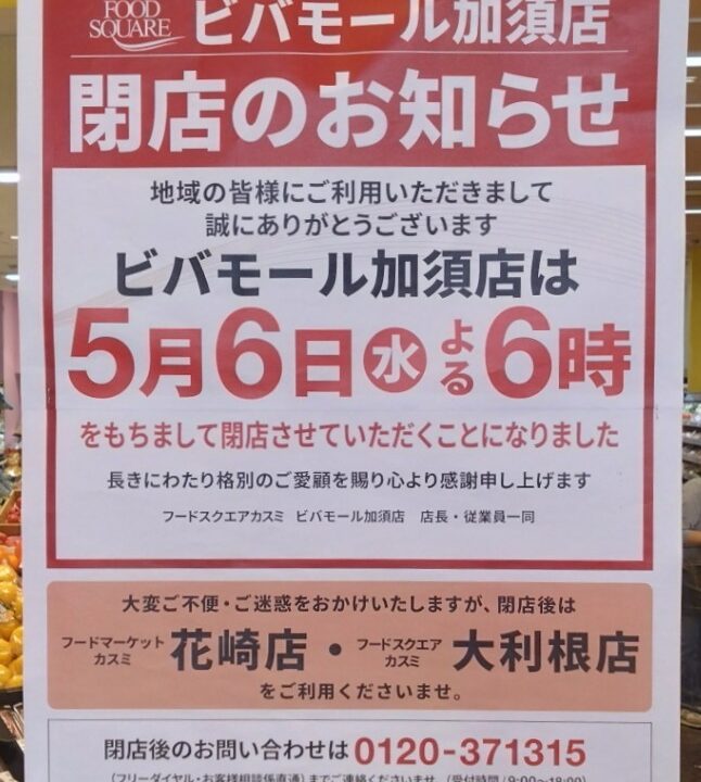 以前お伝えした、ビバモール加須内のスーパー「フードスクエア カスミ」の閉店まで、残り約2週間となりました。