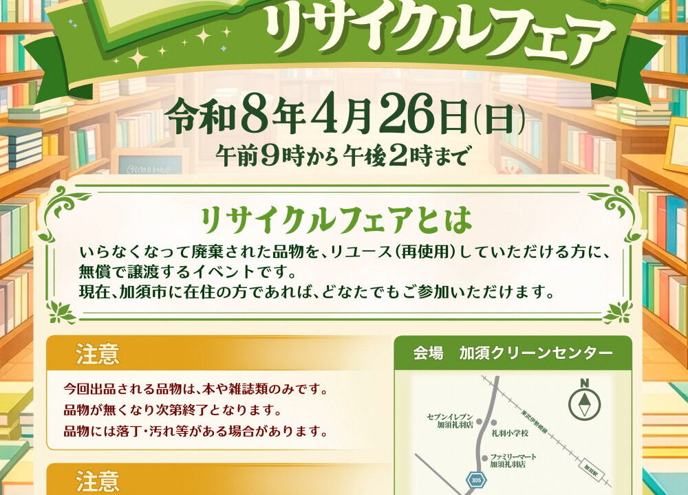 今回は、加須クリーンセンターで4月26日(日)に開催される、「本のリサイクルフェア」についてご紹介します!