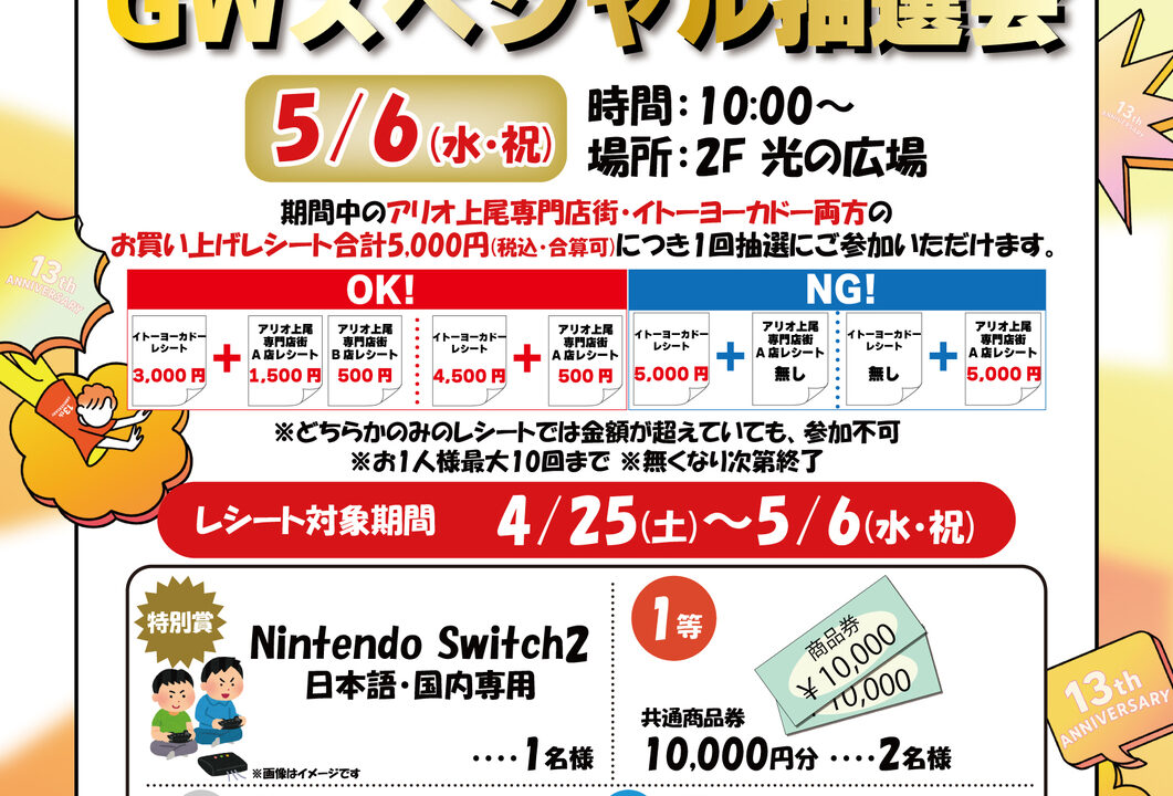 アリオ上尾13th ANNIVERSARY GWスペシャル抽選会は5月6日に開催されます。
