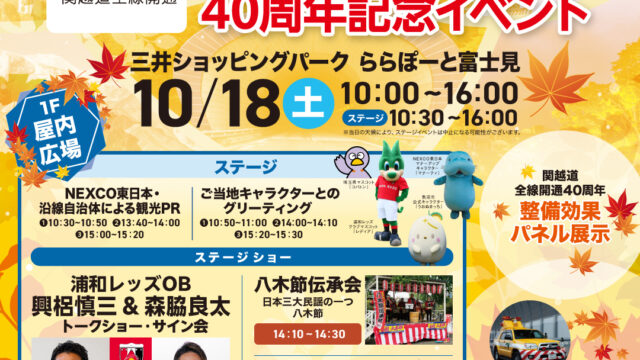 イベント情報 【富士見市】関越道全線開通40周年記念イベントが開催されます!! 2025年10月15日 ライト https://saitama-city-marathon.jp/wp-content/uploads/2025/09/4e2d7087313ba0a483032f29eb8d8bed.png 埼玉マガジン 埼玉マガジンライターのライトです。 今回はららぽーと富士見でイベントが開催されるのでご紹介します! 関越道全線開通40周年の記念イベント …