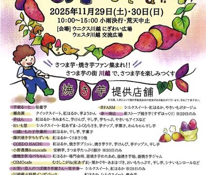イベント情報 【川越市】楽しみすぎる~♪「小江戸川越お芋festival!!」が11/29(土)・30日(日)に開催されます! 2025年11月16日 まーみー https://saitama-city-marathon.jp/wp-content/uploads/2025/09/4e2d7087313ba0a483032f29eb8d8bed.png 埼玉マガジン